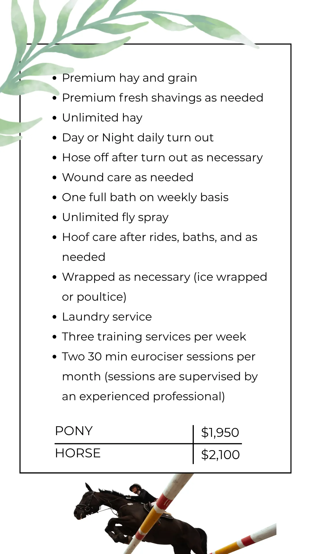 All novice riders must take a minimum of four 1-hour lessons in the beginning of the program. All monthly packages are discounted!