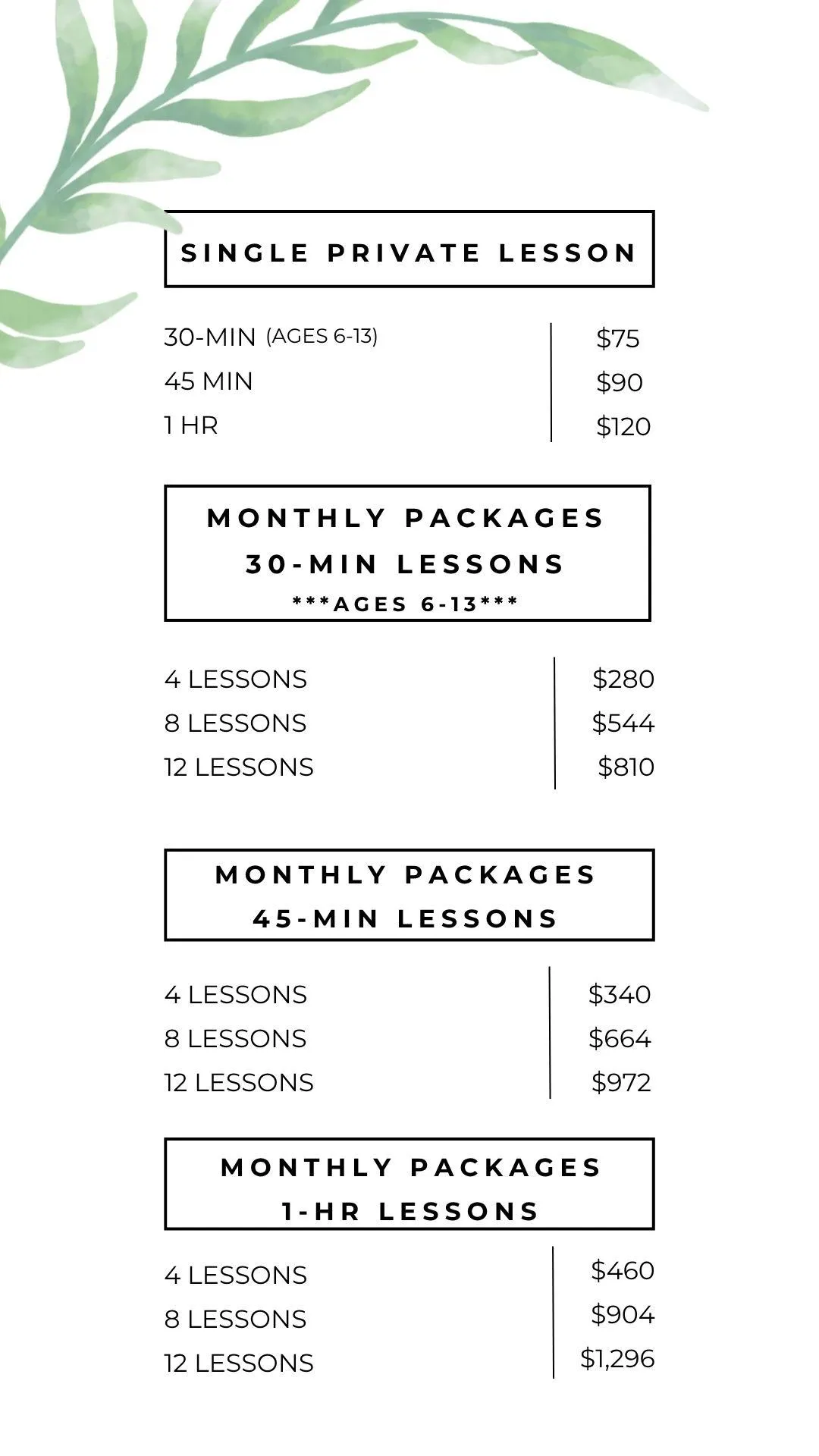 We offer 30-min lessons (only for ages 6-13), 45-min, and 1-hr